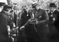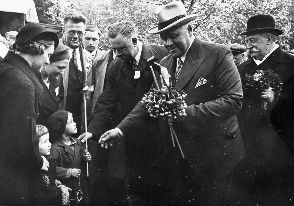 Bērnu svētki Arkādijas parkā, Torņakalnā. Latvijas Valsts un Ministru prezidentu Kārlis Ulmanis sarunā ar bērniem, dāvājot tiem papīra vējdzirnaviņas. 1. rindā no labās: 1. Kārlis Ulmanis, 2. Izglītības ministrijas tautskolu direktors Mārtiņš Soste. 2. rindā no labās 1. izglītības ministrs Augusts Tentelis.
