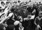 Bērnu svētki Miera dārzā, Latgales priekšpilsētā. Goda viesu sagaidīšana. Latvijas Valsts un Ministru prezidentu Kārlis Ulmanis (centrā) ierodas svētkos. 1. rindā no kreisās: 1. Izglītības ministrijas tautskolu direktors Mārtiņš Soste, 3. izglītības ministrs Augusts Tentelis. 2. rindā no labās 2. svētku tehniskais vadītājs - Izglītības ministrijas fiziskās audzināšanas inspektors Voldemārs Cekuls.