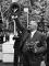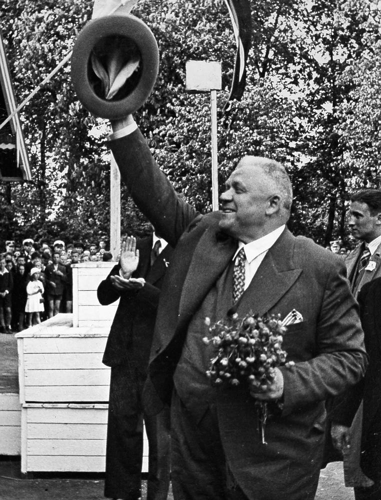 Bērnu svētki Miera dārzā, Latgales priekšpilsētā. Goda viesu sagaidīšana. Latvijas Valsts un Ministru prezidentu Kārlis Ulmanis ar saulpurenēm rokās sveic svētku dalībniekus.
