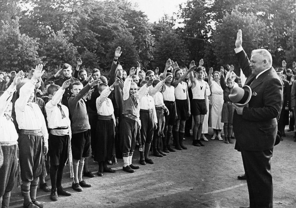 Bērnu svētki Miera dārzā, Latgales priekšpilsētā. Goda viesu sagaidīšana ar špaleru. Latvijas Valsts un Ministru prezidentu Kārlis Ulmanis sveic svētku dalībniekus.