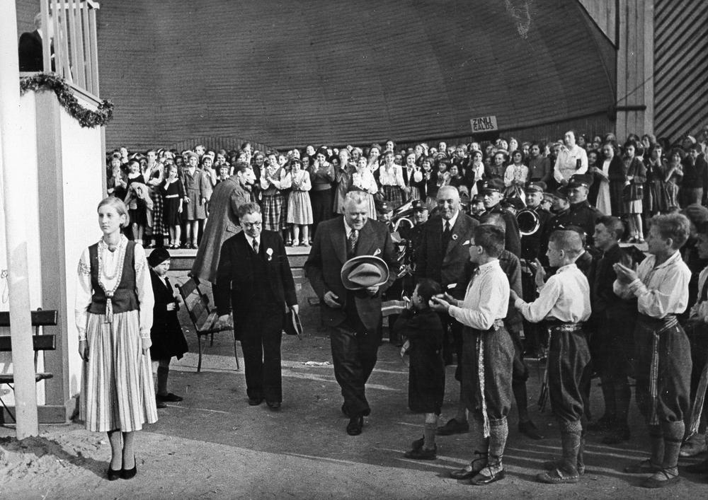 Bērnu svētki Miera dārzā, Latgales priekšpilsētā. Goda viesu sagaidīšana estrādē, kori diriģē diriģents Jankovskis. Centrā no kreisās: 1. svētku prezidija priekšsēdētājs - Rīgas pilsētas Izglītības valdes priekšnieks Andrejs Vičs, 2. Latvijas Valsts un Ministru prezidentu Kārlis Ulmanis.