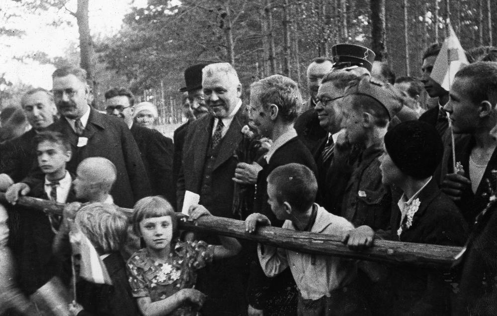 Bērnu svētki Jaunciemā. Goda viesi ar bērniem. 2. rindā no kreisās: 2. Izglītības ministrijas tautskolu direktors Mārtiņš Soste, 3. Latvijas Valsts un Ministru prezidents Kārlis Ulmanis, 4. svētku prezidija priekšsēdētājs - Rīgas pilsētas Izglītības valdes priekšnieks Andrejs Vičs. 2. rindā no kreisās: 1. Kārļa Ulmaņa sekretārs Jānis Cimmermanis (no 1939. gada Rudums), 2. izglītības ministrs Augusts Tentelis.