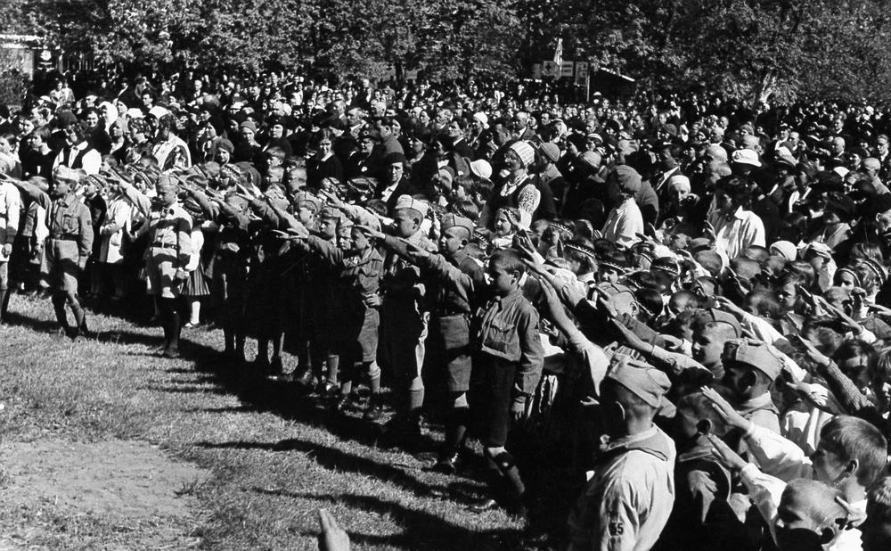 Bērnu svētku dalībnieki sveic goda viesus Saules dārzā, Mežaparkā.
