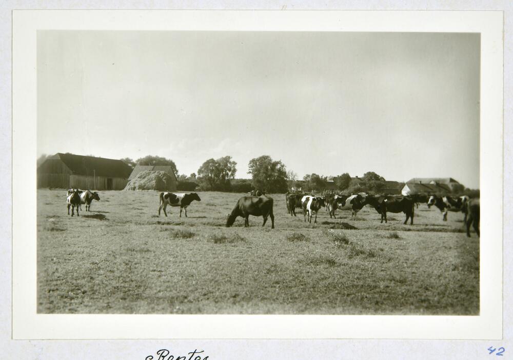 Bērzmuižas pagasta lauku mājas "Rentes". Priekšplānā govju ganāmpulks ganībās.