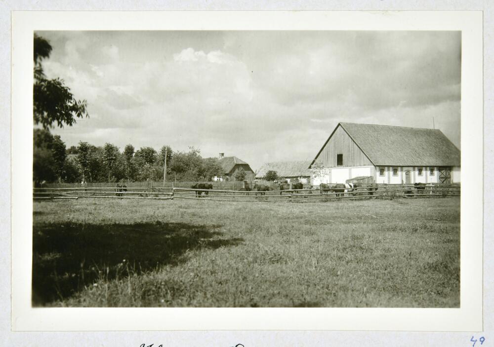 Bērzmuižas pagasta lauku mājas "Kūras". Priekšplānā govju ganāmpulks laidarā.