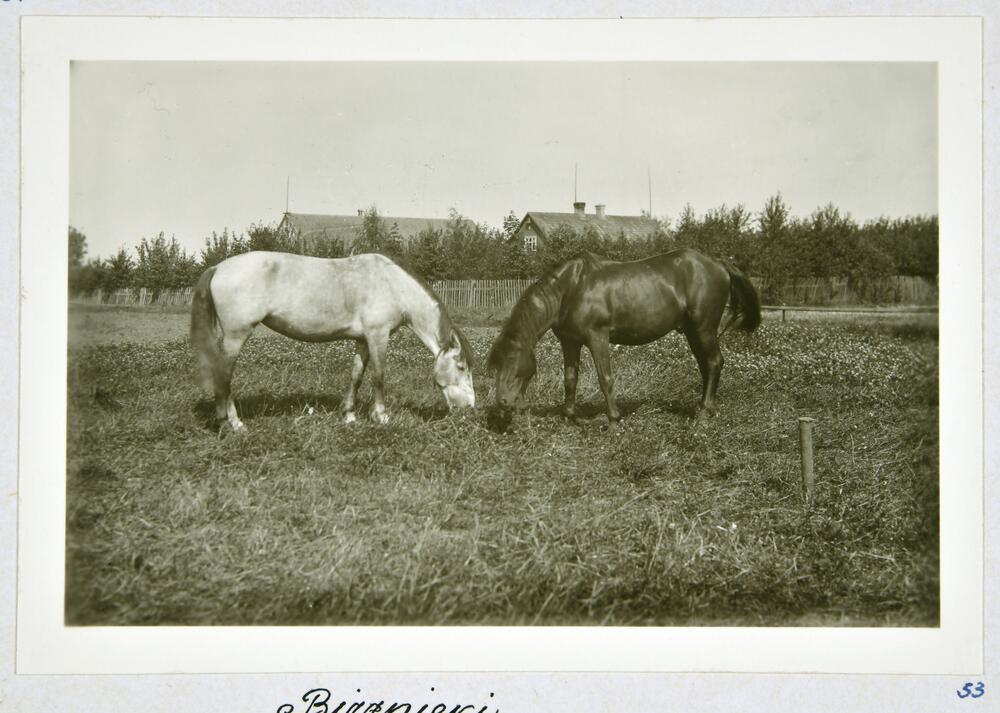 Bērzmuižas pagasta lauku mājas "Birznieki". Priekšplānā divi zirgi ganībās.