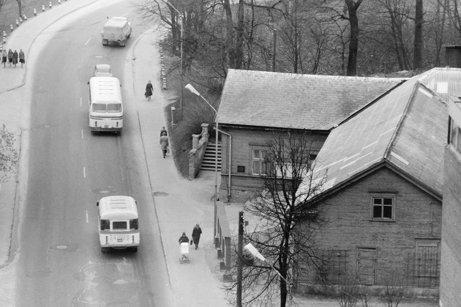 Redzama Lācplēša iela (tolaik Padomju iela) un teātra ēka jeb Valmieras Latviešu biedrības koka nams, kurš tek nojaukts 1987.gadā. Tobrīd teātrim ir nosaukums Leona Paegles Valsts Valmieras drāmas teātris, tā direktors - Pēteris Sūcis, kura vadībā notiek teātra jaunās ēkas celtniecība.