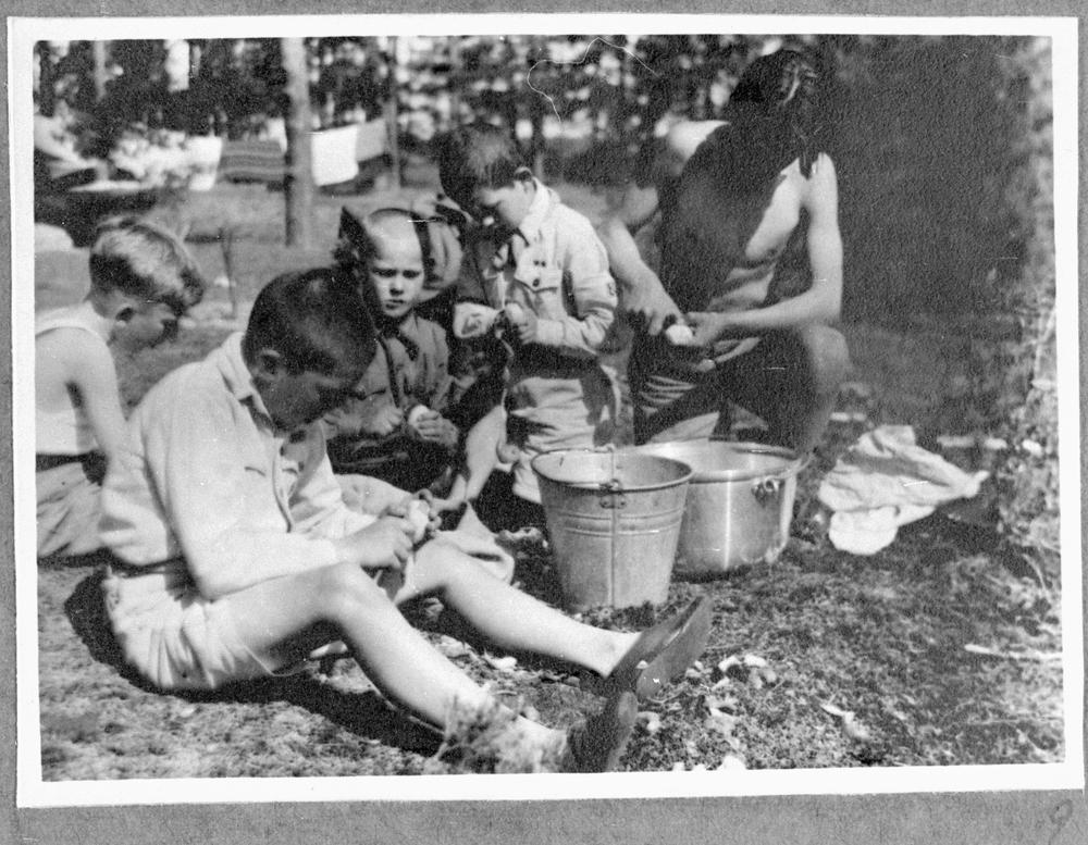 Latvijas Skautu centrālās organizācijas nometne. Skauti telšu pilsētiņā tīra kartupeļus.