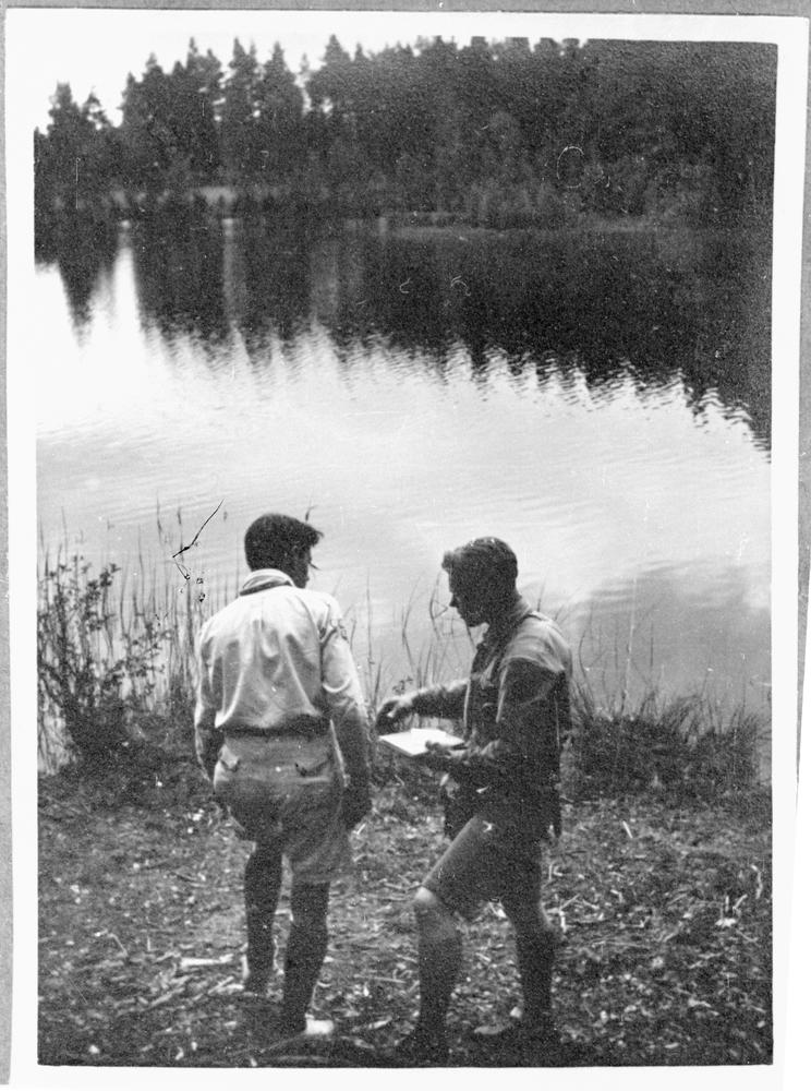 Latvijas Skautu centrālās organizācijas skauti pārgājiena laikā pa Latviju. Atpūtas brīdis pie upes.