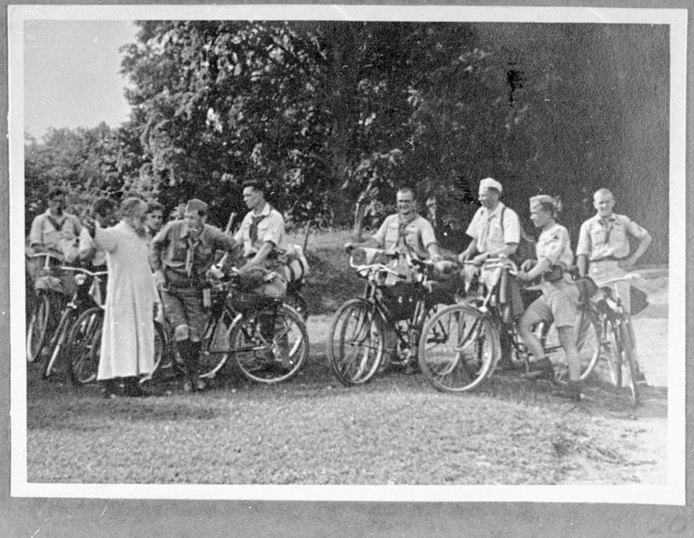 Latvijas Skautu centrālās organizācijas skautu grupa velobraucienā pa Latviju. Skauti ar velosipēdiem atpūtas brīdī.