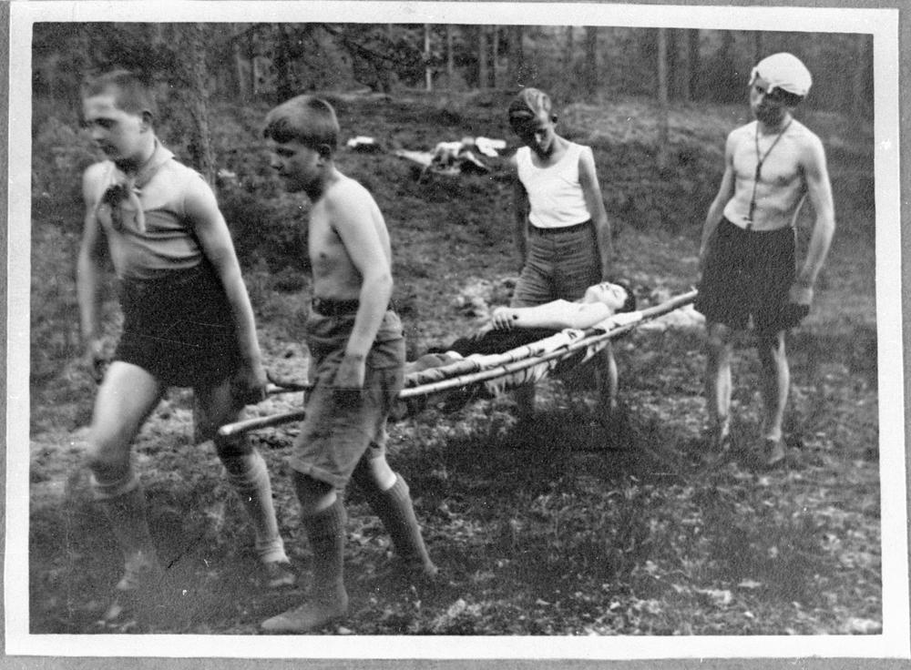 Latvijas Skautu centrālās organizācijas skautu grupa pirmās palīdzības apmācības laikā mežā.