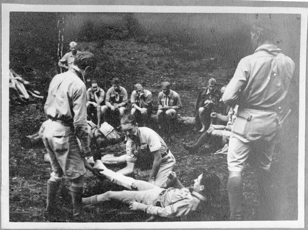 Latvijas Skautu centrālās organizācijas skautu grupa pirmās palīdzības apmācības laikā mežā.