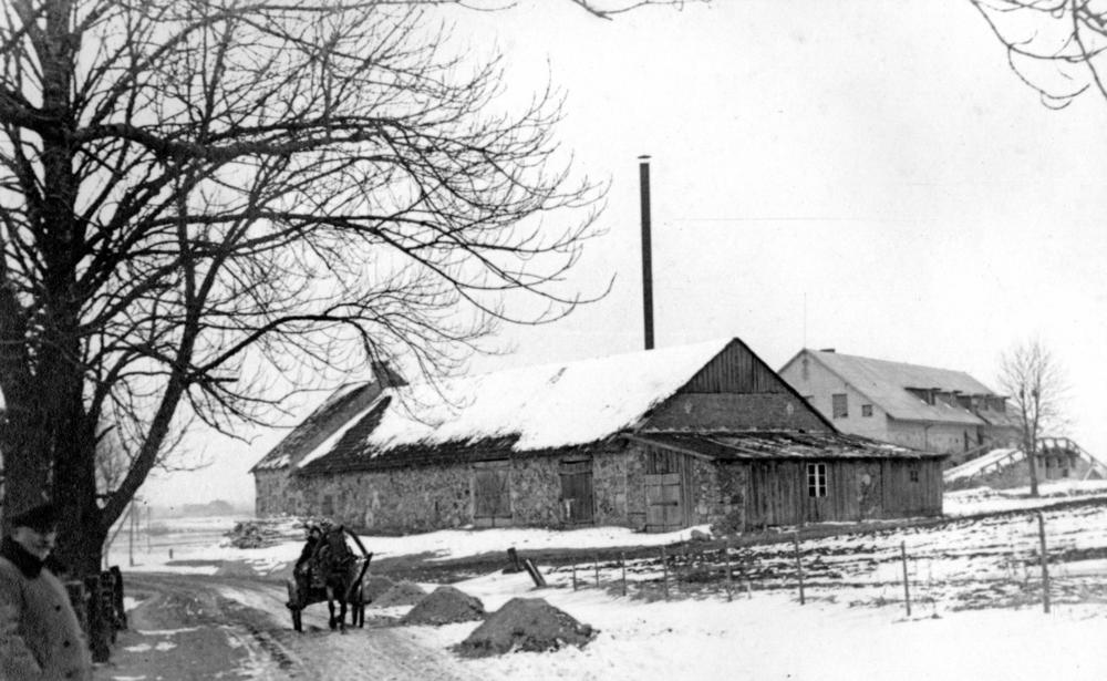 Ārlavas muižai piederošā stērķeļu un sīrupa fabrika ziemā. Priekšplānā pajūgs.