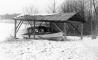 Sasmakas ezers pie Ārlavas muižas ziemā. Priekšplānā nojume ar motorlaivu.