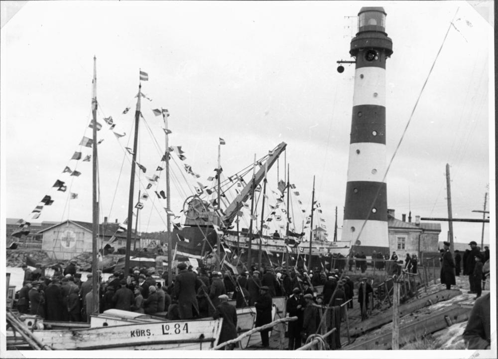 Liepājas osta pirmajos Zvejnieku svētkos. Fonā ostas bāka (uzcelta 1868. gadā).