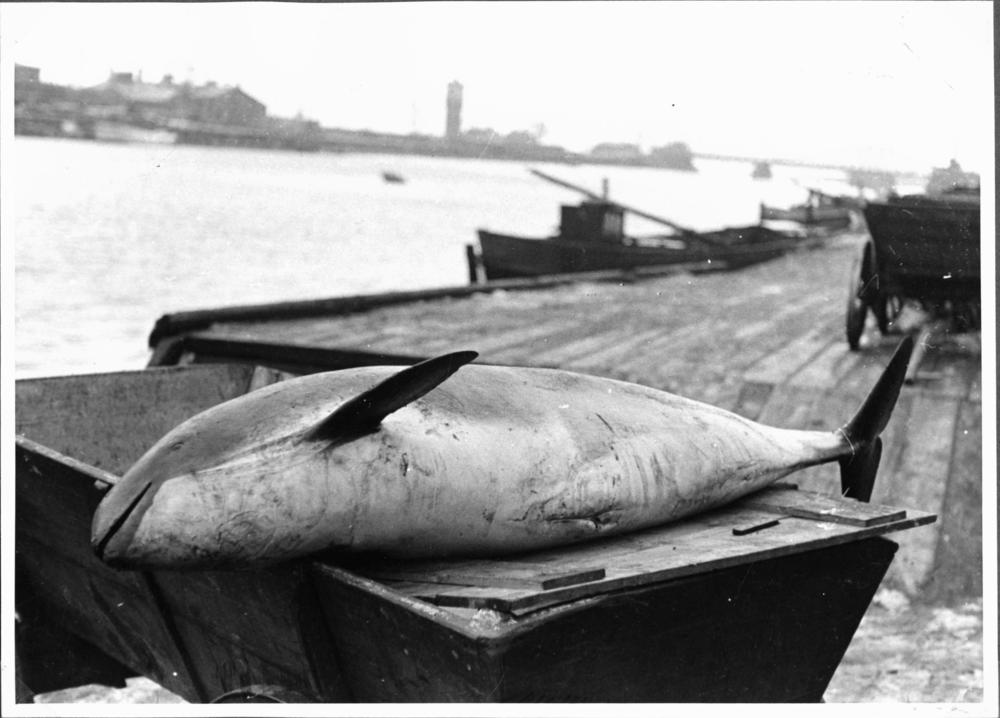 Liepājas zvejnieku ostas piestātnē zvejnieku nozvejotais delfīns.