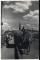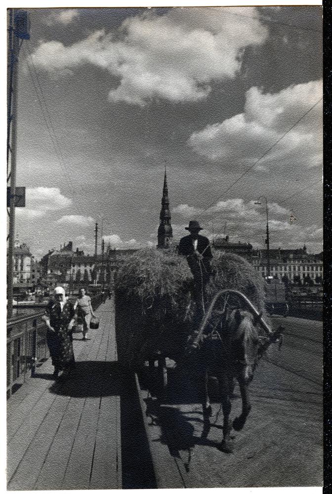 Pajūgs ar siena vezumu brauc pāri pontona tiltam. Fonā - Svētā Pētera baznīcas tornis.