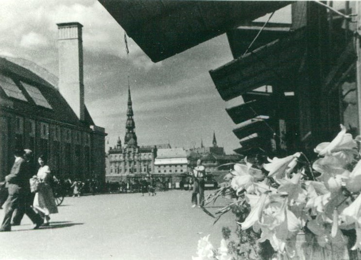 Centrāltirgus laukums, kur tiek pārdoti ziedi. Panorāma uz Rīgas Svētā Pētera baznīcu.