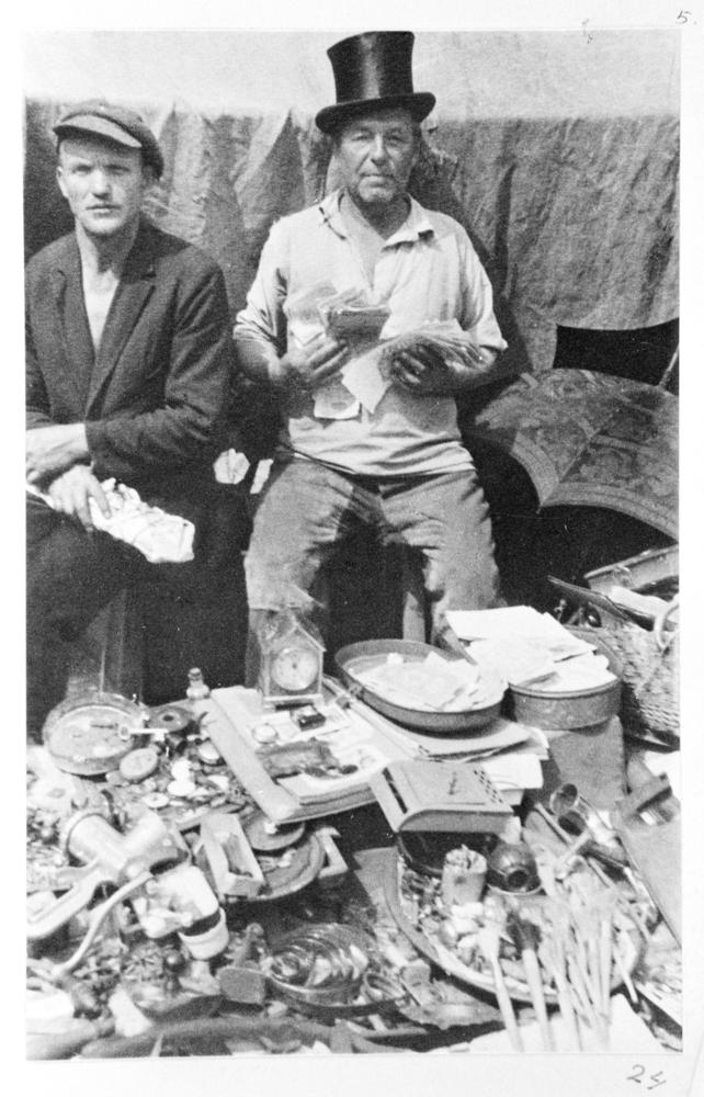 Sīkumtirgotāji. Tirgotājs, ar cilindru galvā, demonstrē iekasētās naudaszīmes.