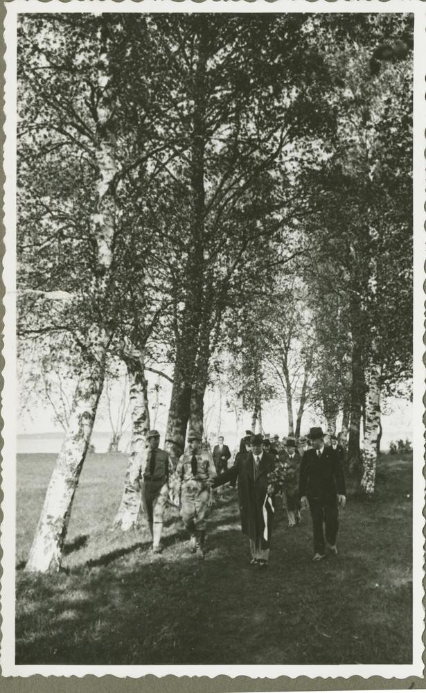 Latvijas Valsts un Ministru prezidents Kārlis Ulmanis (centrā) pastaigas laikā bērzu birzī, viesojoties Latvijas Lauksaimniecības kameras organizētajos Otrajos Latvijas Pļaujas svētkos Latgalē.