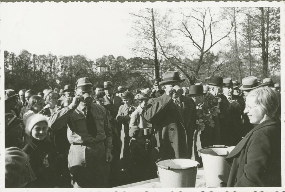 Latvijas Valsts un Ministru prezidents Kārlis Ulmanis (no labās) nogaršo dzērienu, viesojoties Latvijas Lauksaimniecības kameras organizētajos Otrajos Latvijas Pļaujas svētkos Latgalē.
