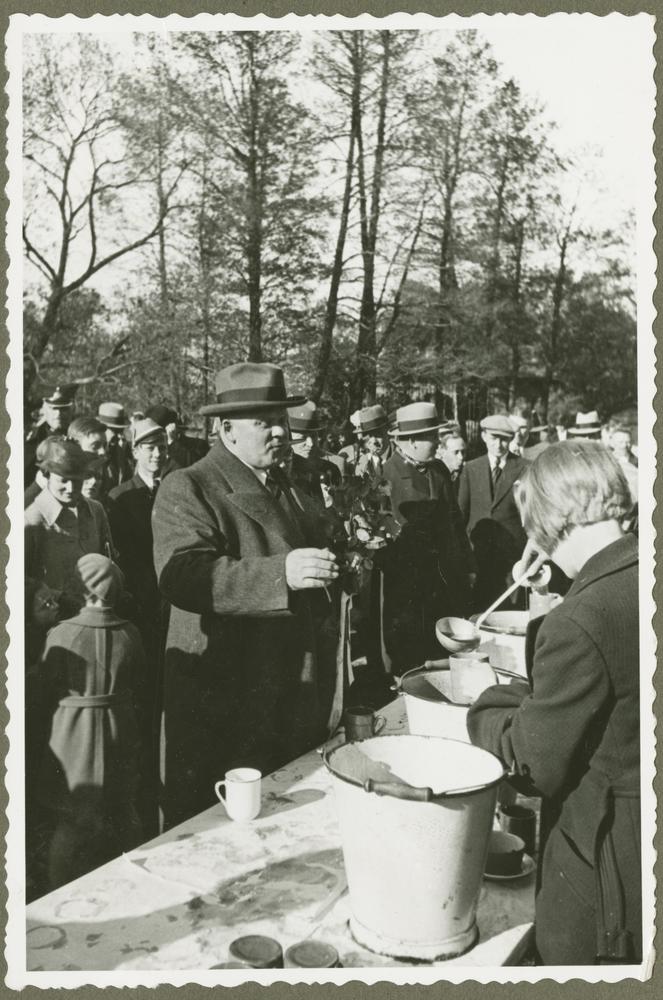 Latvijas Valsts un Ministru prezidents Kārlis Ulmanis (no kreisās) nogaršo dzērienu, viesojoties Latvijas Lauksaimniecības kameras organizētajos Otrajos Latvijas Pļaujas svētkos Latgalē.