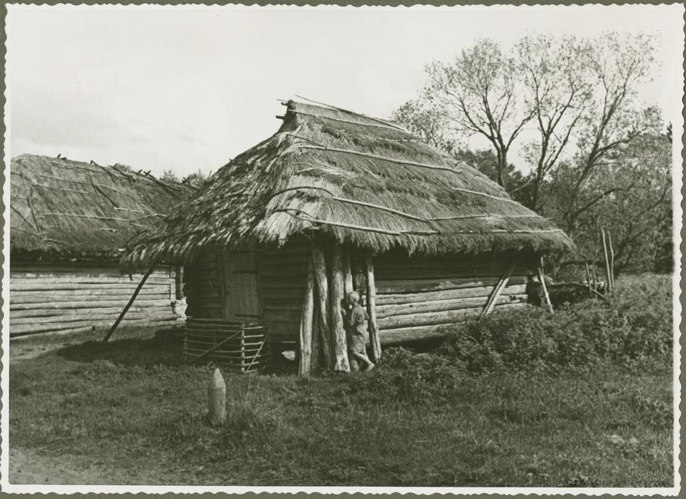 Zemnieku sēta Latgalē. Pie guļbaļķu ēkas ar salmu jumtu stāv zēns.