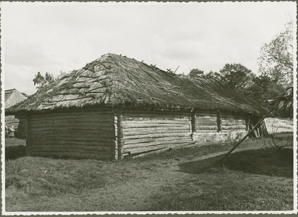 Zemnieku sēta Latgalē. Guļbaļķu ēka ar salmu jumtu.