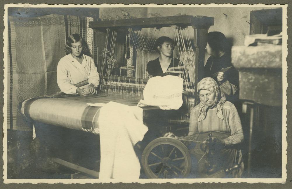 Sievietes no Madonas apriņķa Ļaudonas pagasta Siliešu ciema pie vērpjamā ratiņa un aužamajām stellēm.
