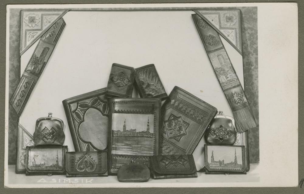 Madonas apriņķa Ļaudonas pagasta Siliešu ciema rokdarbnieces, mājturības skolotājas Annas Simsīķes (Simsikas) izgatavotie dekoratīvie ādas izstrādājumi - bloknoti, maki, grāmatzīmes.