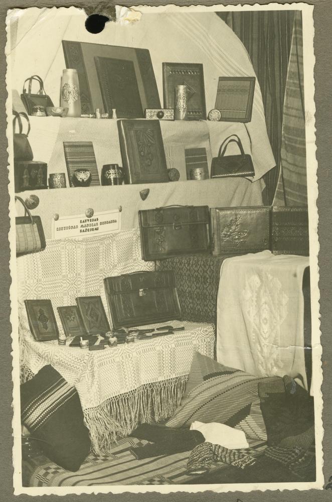Ļaudonas pļaujas svētku skatē izstādītie rokdarbnieces, mājturības skolotājas Annas Simsīķes (Simsikas) izgatavotie dekoratīvie ādas izstrādājumi.