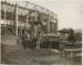 Tiek būvēts Latvijas paviljons (pēc arhitekta Sergeja Antonova projekta) Briseles starptautiskajai izstādei. Cilvēku grupa pie jaunbūves.