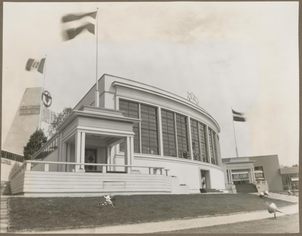Briseles starptautiskās izstādes Latvijas paviljona (arhitekts Sergejs Antonovs) fasāde.