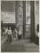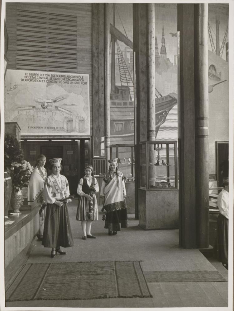 Briseles starptautiskās izstādes Latvijas paviljona (arhitekts Sergejs Antonovs) izstāžu zāle ar priekšplānā sievietēm tautastērpos, fonā pie sienas Latvijas eksporta preču tabula.