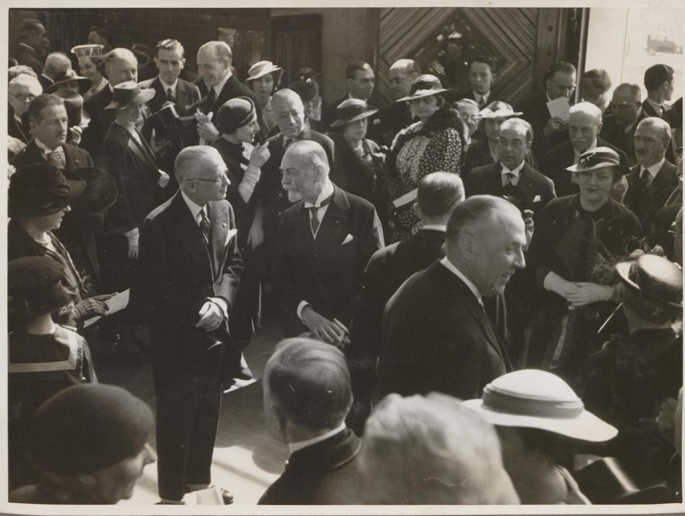 Briseles starptautiskās izstādes Latvijas paviljona (arhitekts Sergejs Antonovs) atklāšanas pasākums. No kreisās: 1. Izstāžu komisijas prezidents Ādolfs Makss (Adolphe Max) un 2. Latvijas Republikas sūtnis Beļģijā Jānis Lazdiņš.