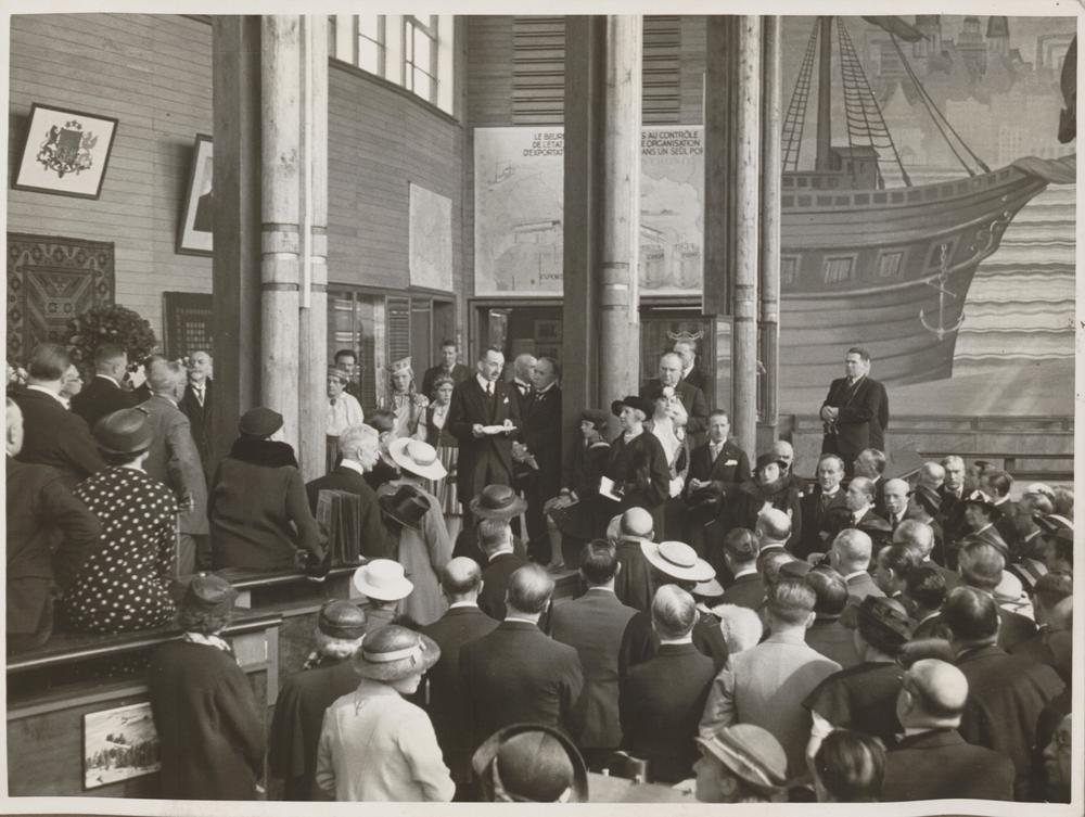Briseles starptautiskās izstādes Latvijas paviljona (arhitekts Sergejs Antonovs) atklāšana pasākuma laikā ar runu uzstājas Latvijas Republikas ģenerālkomisārs Lakosta (centrā).