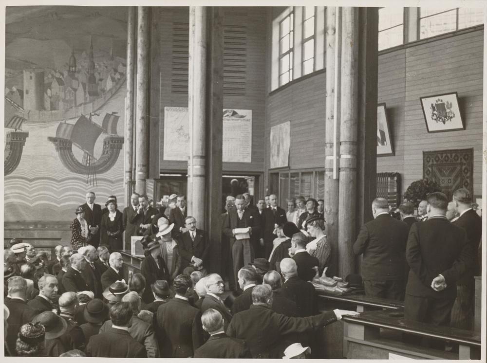 Briseles starptautiskās izstādes Latvijas paviljona (arhitekts Sergejs Antonovs) atklāšana pasākuma laikā ar runu uzstājas Latvijas Republikas Finanšu ministrijas pārstāvis Bruno Pavasars (centrā).