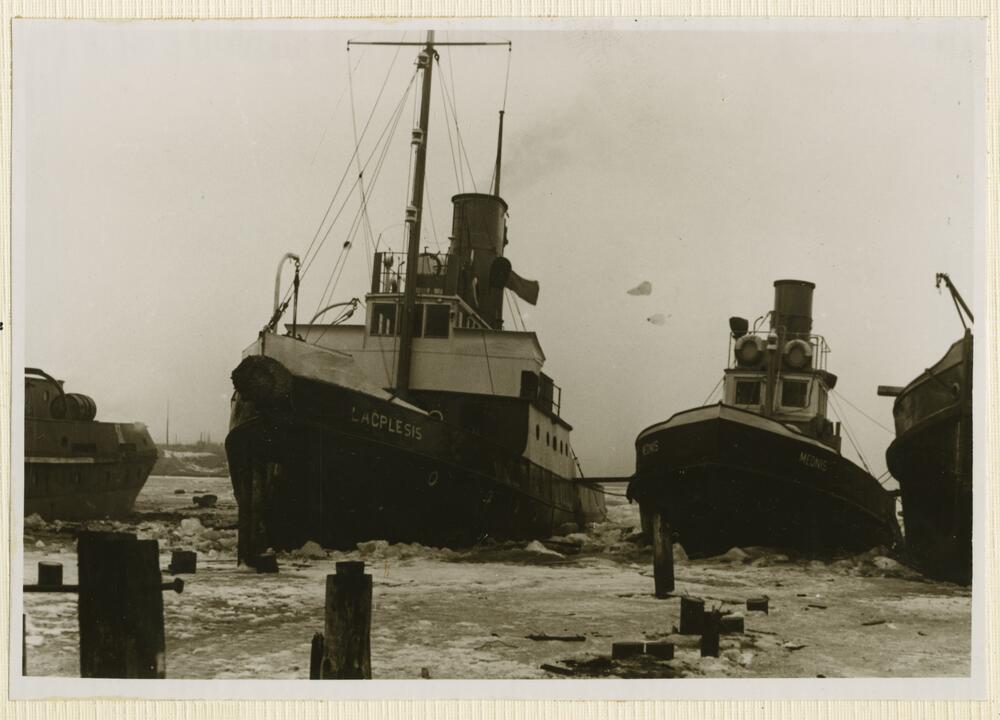 Ledlauži ''Lāčplēsis'' un ''Mednis'' pietauvoti Daugavas krastā.