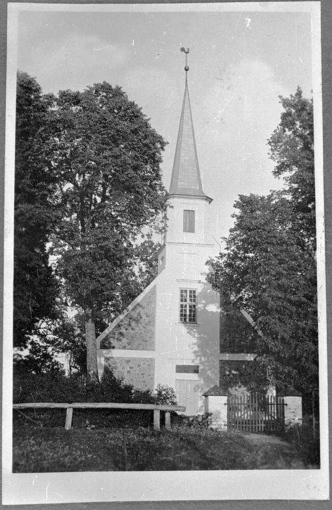 Dikļu evanģēliski luteriskā baznīcas priekšplāns ar ieejas vārtiem.