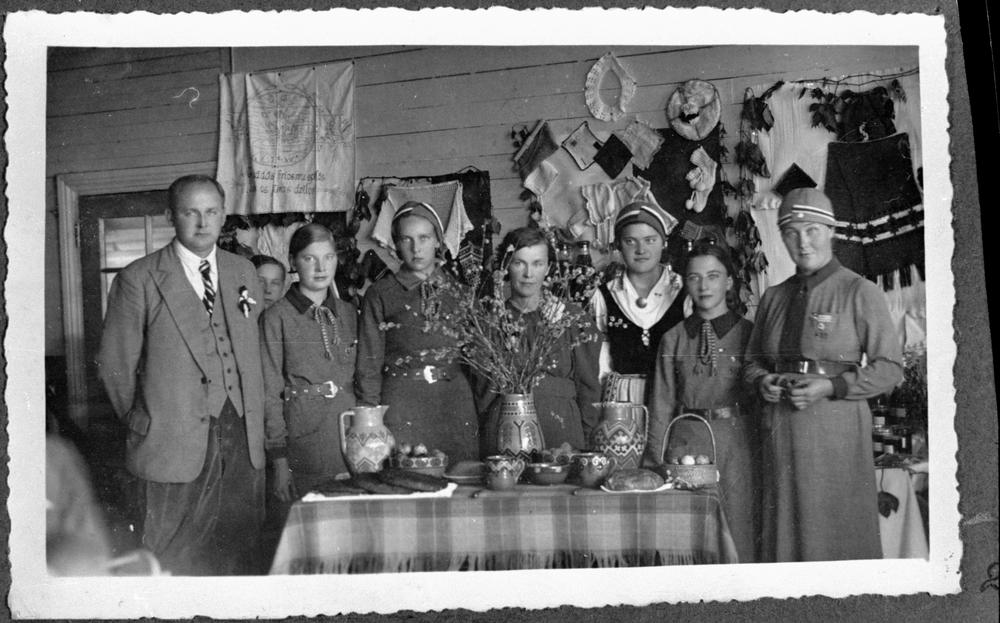 Mazpulku organizācijas dalībnieki ar pašu darinātajiem tekstilizstrādājumiem un keramikas priekšmetiem. Grupas foto telpās.