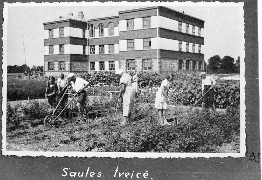 Mazpulku dalībnieki strādā dārzā Valmieras apriņķa Pāles skolas teritorijā. Skola celta 1935. - 1936. gadā, arhitekts Arnolds Nikolajs Čuibe.
