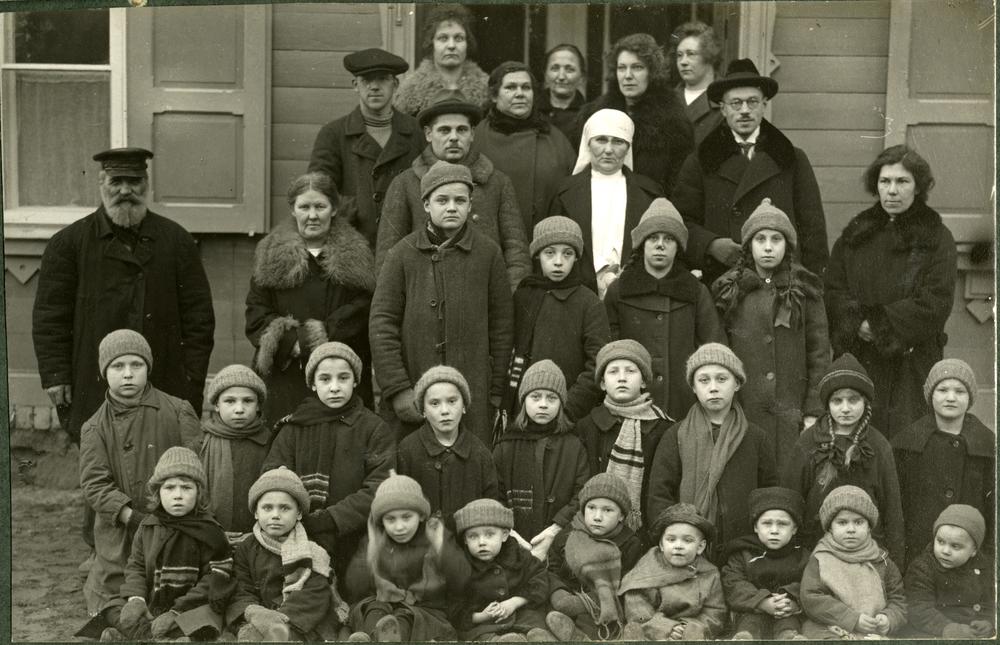 Latvijas Sarkanā Krusta sanatorijas bērni un medicīnas personāls pie sanatorijas ēkas.
