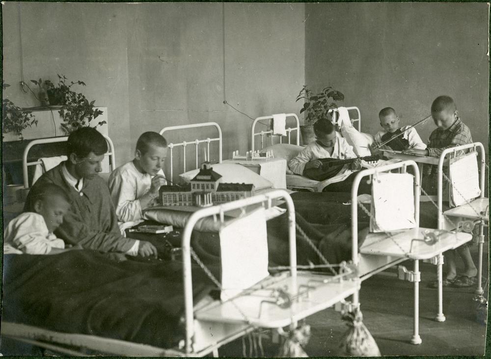 Bērni brīvajā laikā veido maketus un muzicē Latvijas Sarkanā Krusta Krimuldas sanatorijas palātā.