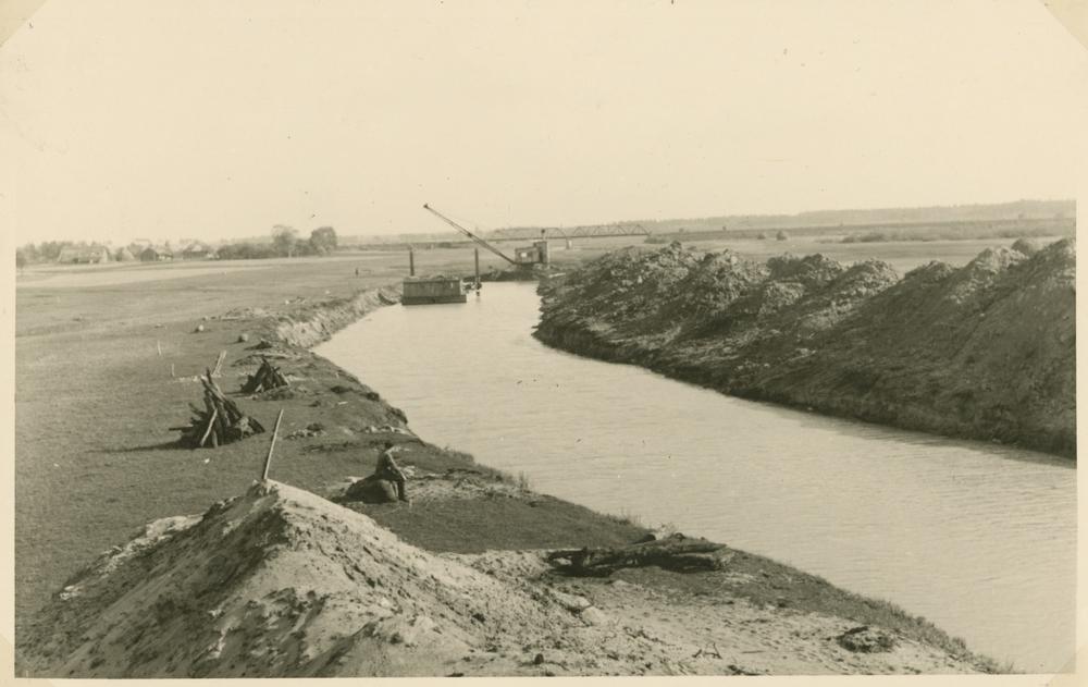 Rakšanas darbi Ičas upē. Centrā - bagarmašīna rok Ičas upi lejas pusē Rēzeknes - Bērzpils dzelzceļa tilta būvniecībai. Fonā - tauvas ekskavators. Meliorācijas darbi Lubānas ezera apkaimē.