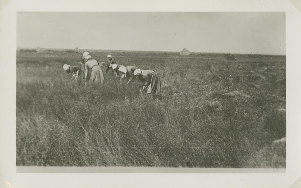 Sievietes plūc linus no Lubānas ezera ūdens atbrīvotajās zemēs pie Īdeņas ciema. Meliorācijas darbi Lubānas ezera apkaimē.