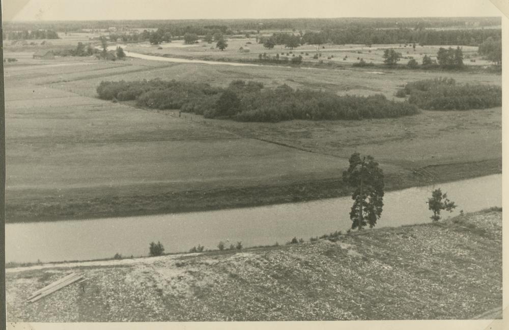 Aiviekste pie Līčagala. Priekšplānā vecā upe, tālumā redzams jaunā pārrakuma uzbērums.
