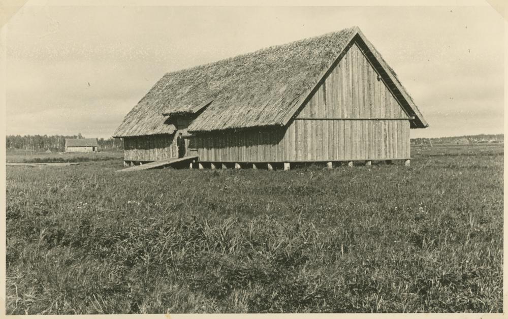 Skats uz siena šķūni ar niedru jumtu kultivētās pļavās pie Abaines Lubānas ezera tuvumā. Meliorācijas darbi Lubānas ezera apkaimē.