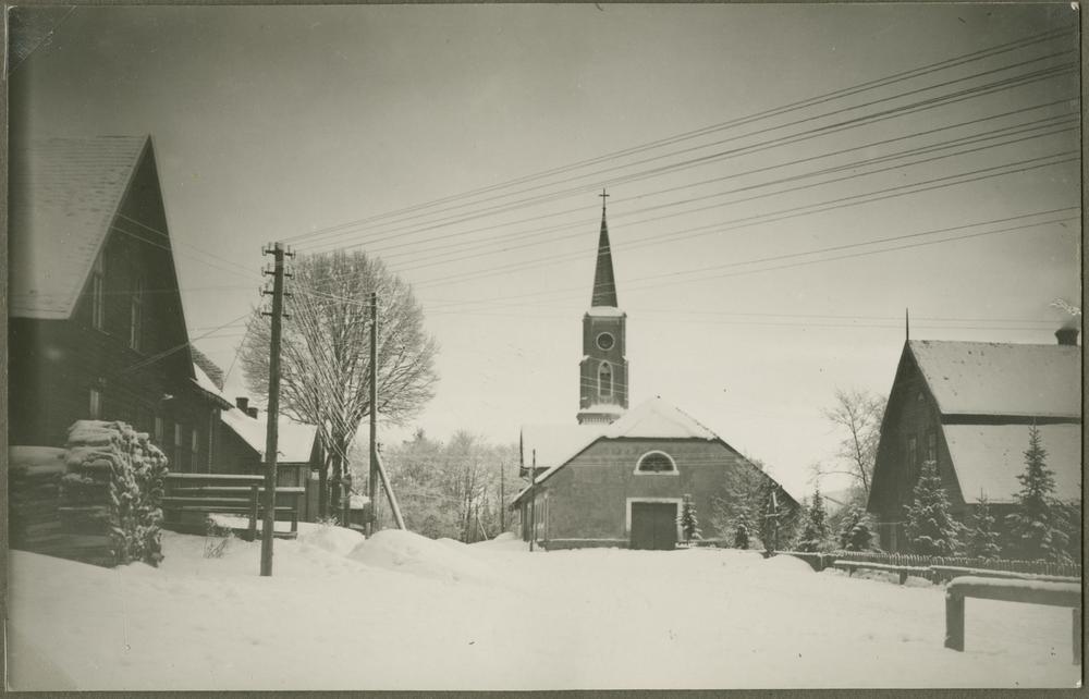 Lubānas ciema skats ziemā. Fonā - Lubānas Evaņģēliski luteriskās draudzes baznīca (celta no 1869. līdz 1872. gadam pēc J. Kampes projekta neogotikas stilā). Meliorācijas darbi Lubānā.