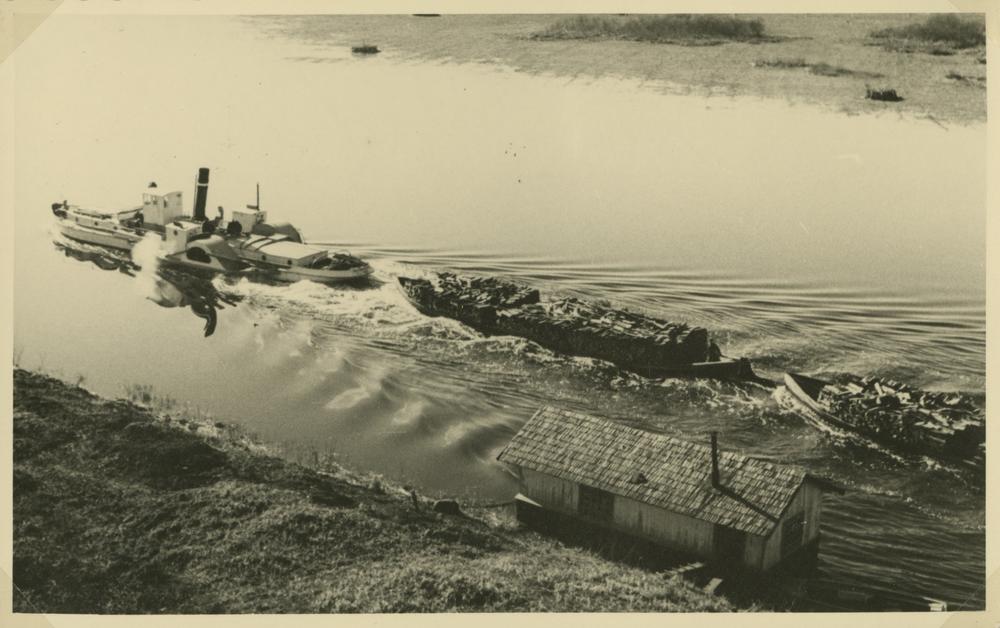 Tvaikonis "Kultūrtehniķis" velk liellaivas ar malku pa Aiviekstes upi. Meliorācijas darbi Lubānas ezera apkaimē.