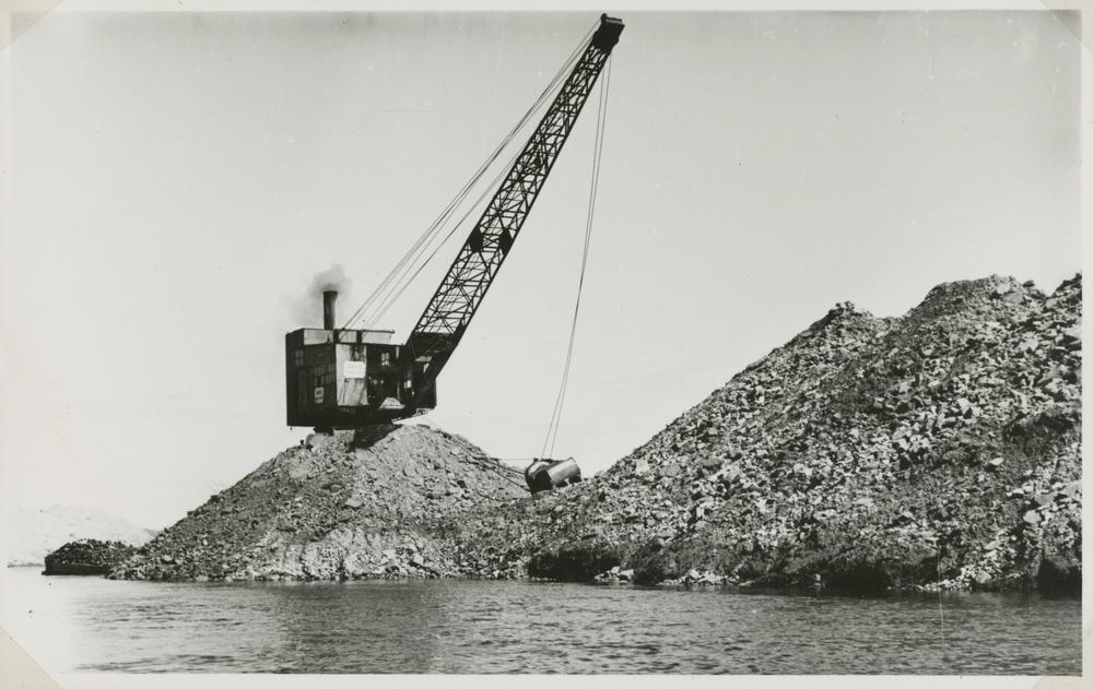 Izbagarētās klintis Aiviekstes krācēs Saikavā. Centrā - Tauvas ekskavators rok klinti. Meliorācijas darbi Lubānas ezera apkaimē.
